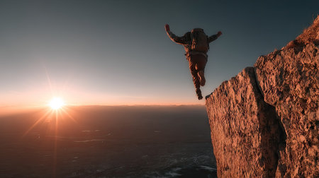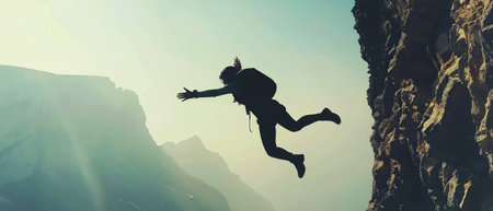 Action shot of a person jumping from a cliff, conveying risk and freedom.