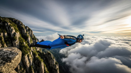 Adventurer in a wingsuit leaps from a rugged cliff into the open sky above scenic landscape