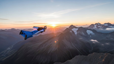 Wingsuit pilot is enjoying an extreme flight over a beautiful mountain valley during sunset