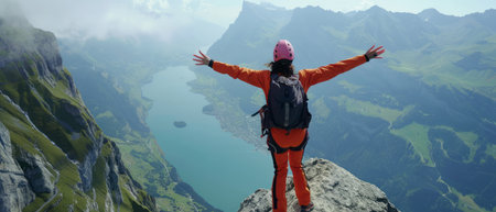 A person is standing on a mountain peak, arms outstretched, showcasing a victorious or triumphant pose against the vast landscape. The individual is likely feeling a sense of achievement or freedom.