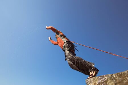 Man jumping off a cliff with a rope on a sunny day.