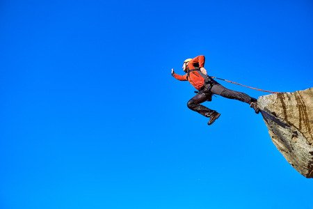 Man in red suit jumping from cliff into the abyss. Freedom concept.