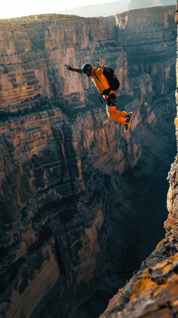 A wingsuit flying enthusiast performs a leap from a rocky cliff edge into a breathtaking canyon below.