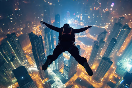 A skydiver glides through the night sky, embracing the rush above a vibrant city filled with lights.