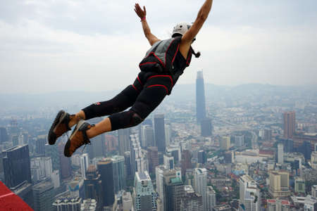 Kuala Lumpur, Malaysia – September 29, 2018: Base Jumpers jump from a 300m high deck during the Kuala Lumpur Tower International Jump.