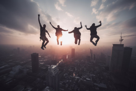 Man silhouetted against the sunset, mid-air over a gap, embodying the spirit of business success and the courage to overcome obstacles