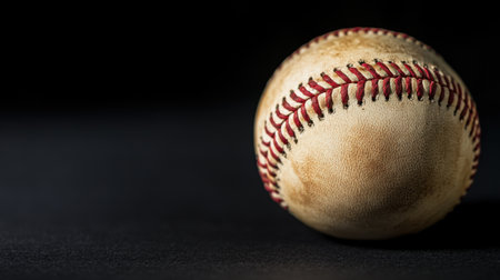 Close up of an old baseball with visible stitching on a black background. the ball is slightly tilted to one side, creating space for text or graphics in front. this design adds depth and texture to your website's banner section. it creates an atmosphere where sports fans can feel the energy and exc