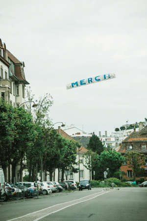 Strasbourg, France - May 9, 2020: MErci thank you large banner across the street during Coronavirus Covid 19 disease pandemic in French city of Strasbourg - message to doctors