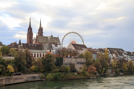 Basel Munster in the river Rhine, at the autumn fair with the ferris wheel in Switzerland