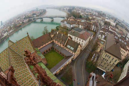 Basel, Switzerland - March 02, 2009: Wide angle aerial view to Basel city from Munster tower on a rainy day in Basel, Switzerland.