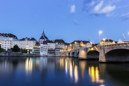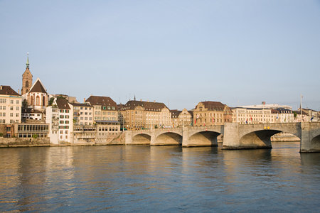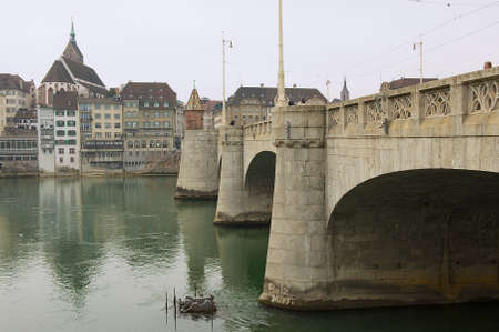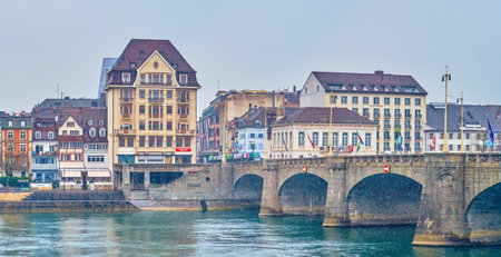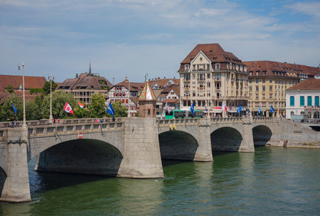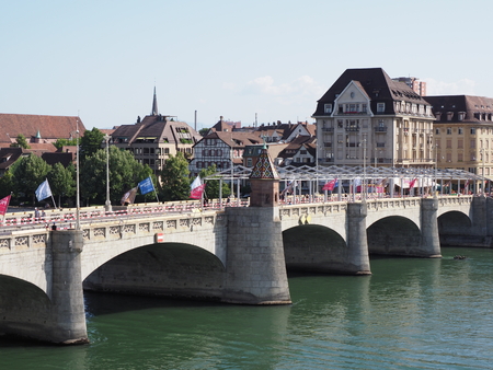 Stony Middle bridge over Rhine River in swiss city Basel center with representative historical buildings in Switzerland
