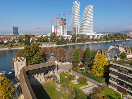 Basel, Switzerland - 17 September 2021: Drone view at the Roche industry towers at Basel on Switzerland