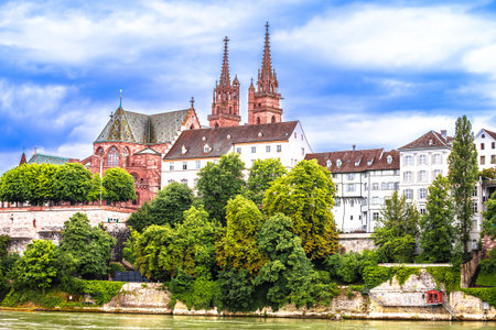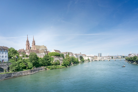 Rhine river and Minster cathedral in Basel waterfront panoramic view, northwestern Switzerland