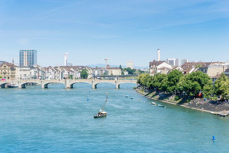 View on the Rhine river and riverside Basel from the Wettsteinbrucke on a sunny day in summer. Basel, Switzerland