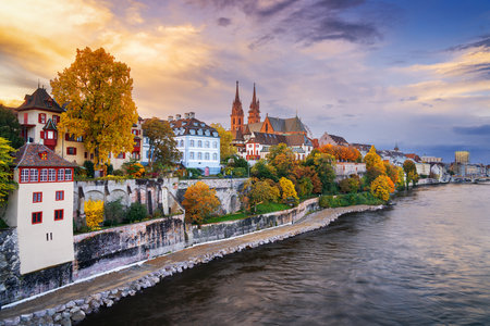 Basel, Switzerland. Beautiful city on Rhine River banks with Munster Cathedral sunset colors. Charming Swiss landscape.