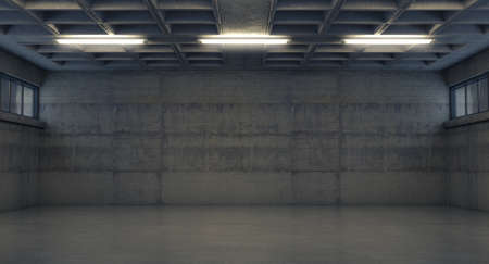 An interior at night of an empty industrial room made mostly of concrete with a row of small windows - 3D render