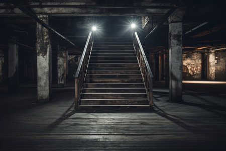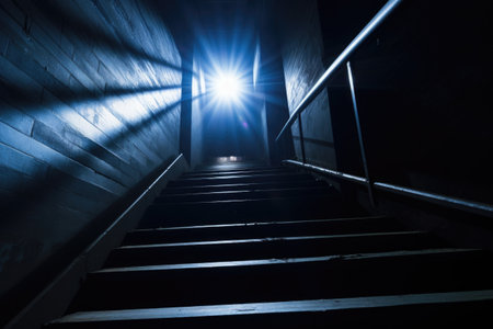 stairs leading to a bright light source, created with generative ai