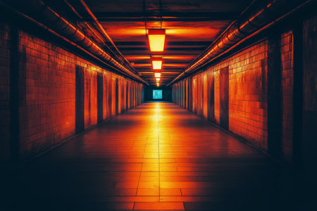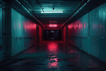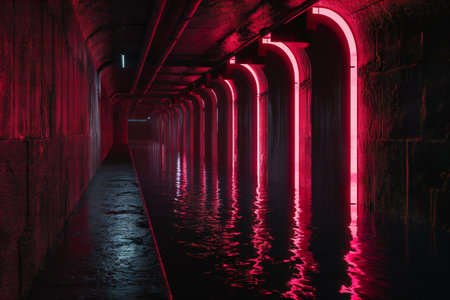 Underground corridor with red lights and reflections.
