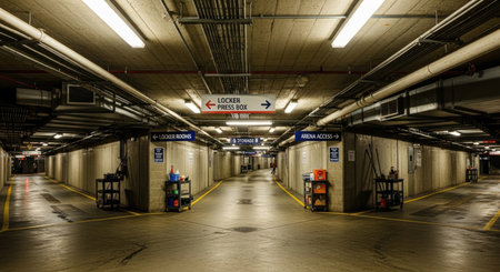 A utilitarian underground hallway with concrete walls and exposed pipes, illuminated by fluorescent lights, leading to locker rooms and arena access.