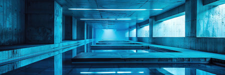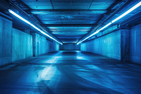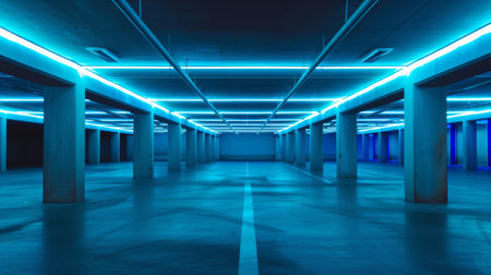 Blue Neon Lights in Empty Parking Garage, An empty underground parking garage bathed in cool blue neon lights, creating a calm and modern ambiance.