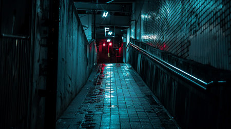 A dark, wet alleyway illuminated by neon signs and red lights, creating a cyberpunk atmosphere. The perspective draws the viewer into the depths of the urban landscape.