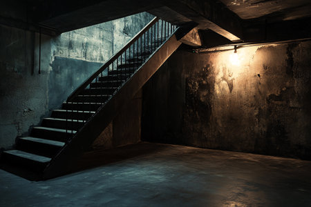 A highangle view of a gritty stairwell with moody lighting, capturing urban decay