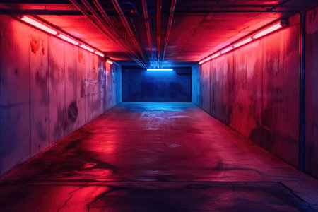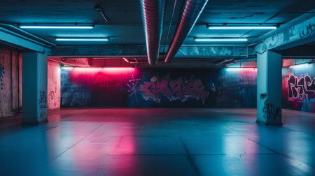 empty underground parking lot with neon lights