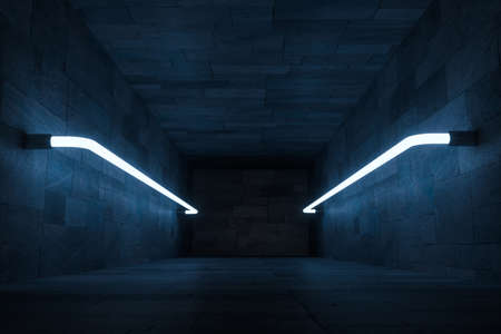 Abandoned underground passage with red lights at night. 3D rendering