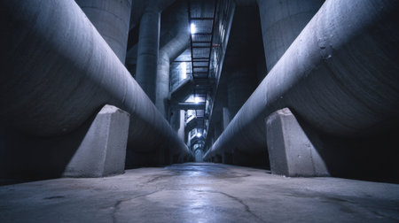 Explore a vast underground passageway featuring large concrete pipes and moody dim lighting, emphasizing industrial architecture and eerie ambiance.