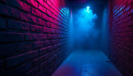 Urban alleyway with neon lighting and mysterious smoke effect