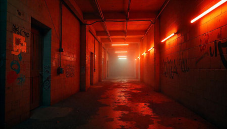 Grungy Red Lit Concrete Hallway with Graffiti and Doors