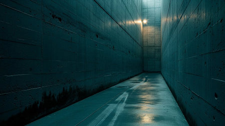 A long, narrow corridor constructed from rough concrete walls. The floor is wet and reflects a single, dim yellow light source from the far end, creating streaks of light and shadow. The overall atmosphere is dark, moody, and industrial, with a sense of emptiness and mystery. The textured concrete and dampness contribute to a gritty and somewhat unsettling visual.