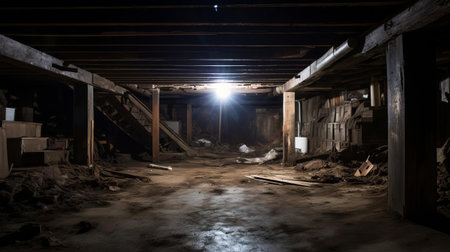 the crawlspace, cluttered with old insulation and debris, desperately requires renovation to improve air quality and energy efficiency, featuring a dimly lit atmosphere with exposed ductwork and worn-out vapor barriers, highlighting the need for a thorough cleanup and modernization. ai generated