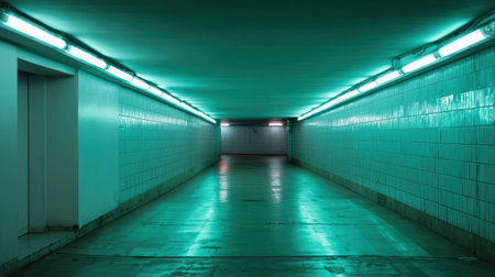 Empty underground pedestrian tunnel with tiled walls and ceiling, fluorescent lights creating vanishing point perspective in urban subway passage.