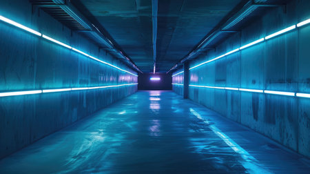 A captivating view of a futuristic underground subway tunnel featuring striking blue neon lights, symmetrical lines, and an empty path that creates a sense of depth and tranquility.