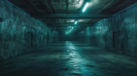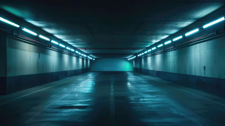 Sci fi looking dark and moody underground parking lot with fluorescent lights on. Wide angle shot