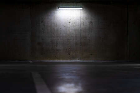 Empty parking lot with overhead dim light, underground parking garage.
