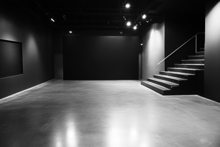 Black and white interior of modern gallery with stairs and blank black wall