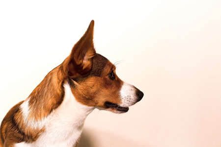 Portrait of red white basenji dog isolated on white background and looking down in sunlight.