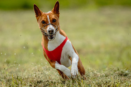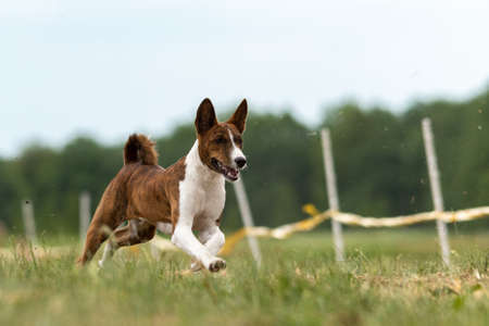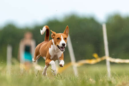 Basenji dog running fast and chasing lure across green field at dog racing competion