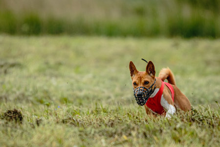Basenji dog in red shirt running and chasing lure in the field on coursing competition