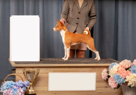 A dog owner shows his pet at a dog show. A Basenji dog on the podium. Congolese Bush dog or Congo Terrier