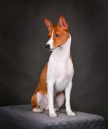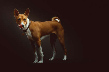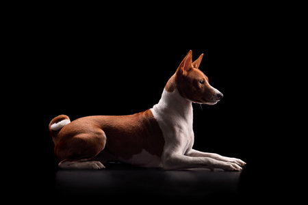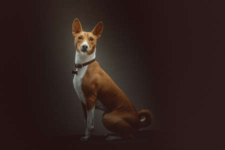 Cute Basenji Terrier Dog. Studio shot. Moody dark lighting, dark background.
