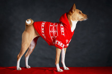 A Basenji dog shivers in knitted clothes in cold weather. Crispy autumn or winter season. It's cold and cold. Cold