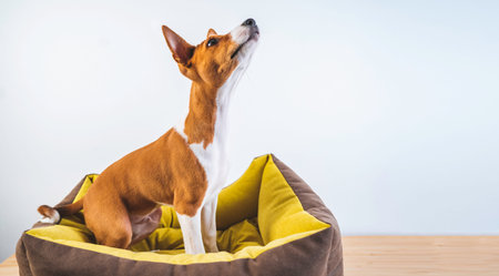 Little Basenji puppy dog playing and trying to pick a treat from the hands of the owner at white wall background.