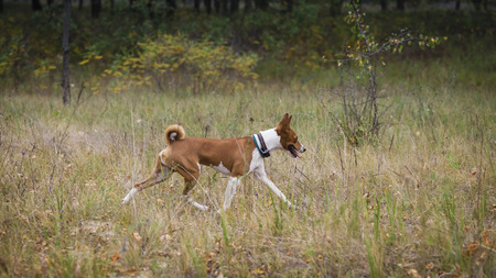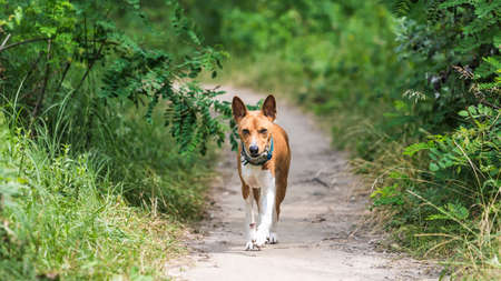 Portrait of a red basenji in a summer forest. Basenji Kongo Terrier Dog.
