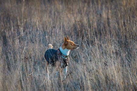 The Basenji dog walks in the park. Winter cold day. Closeup