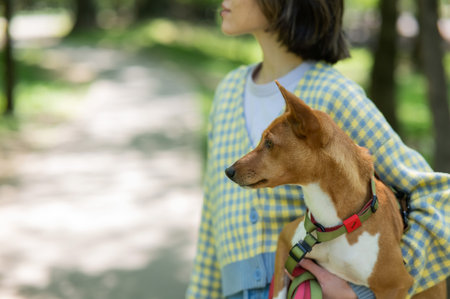 Woman holds a dog in her arms for a walk. non-barking african basenji dog