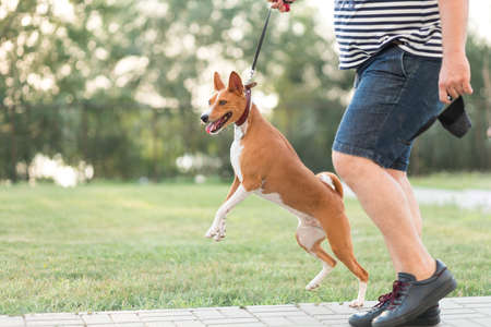 Basenji gives a paw to the mistress on a walk. African non-barking dog