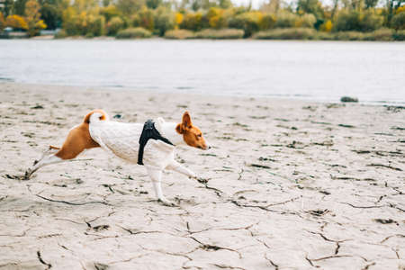 Basenji dog run on a river shore in autumn wearing white sweater.